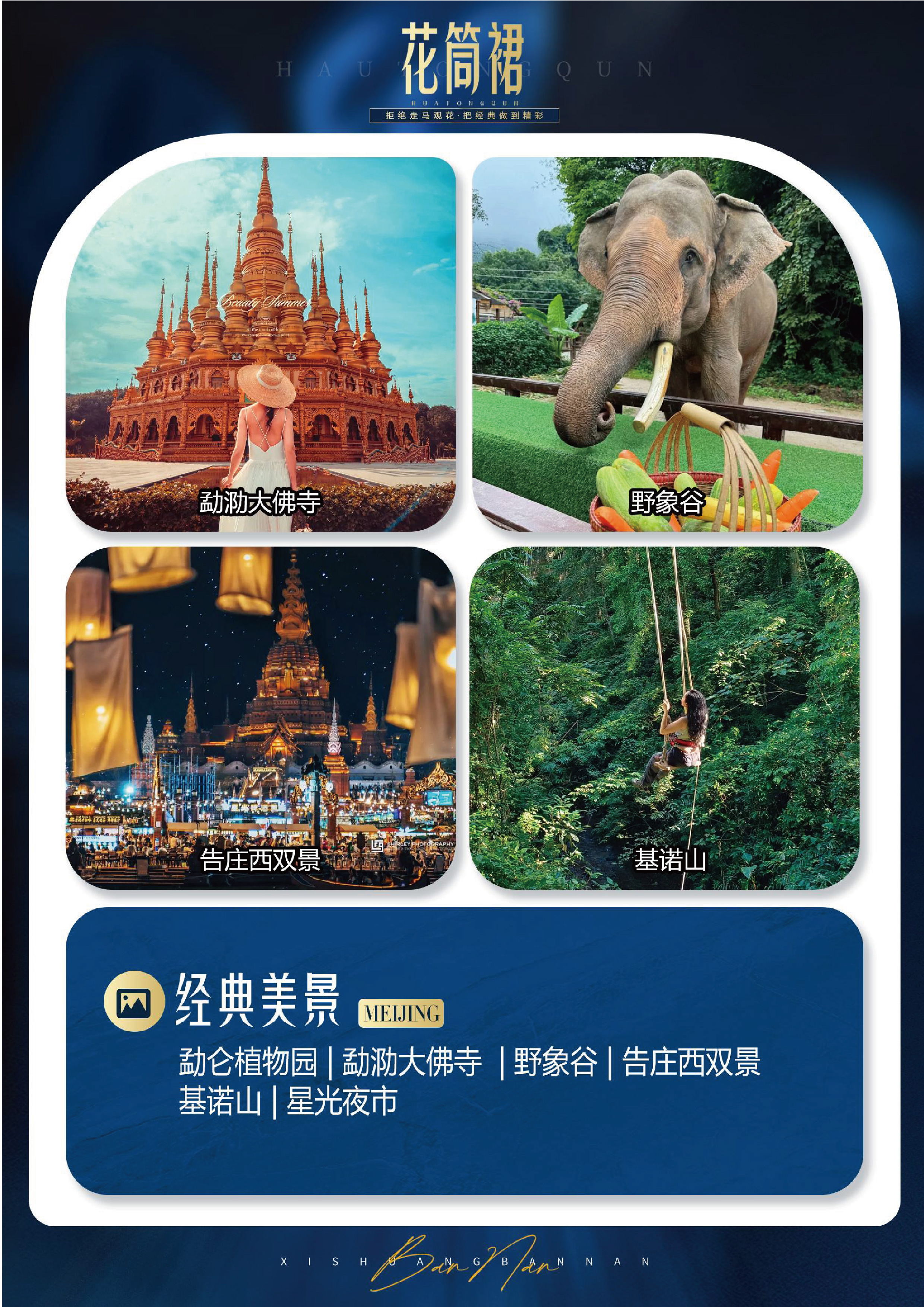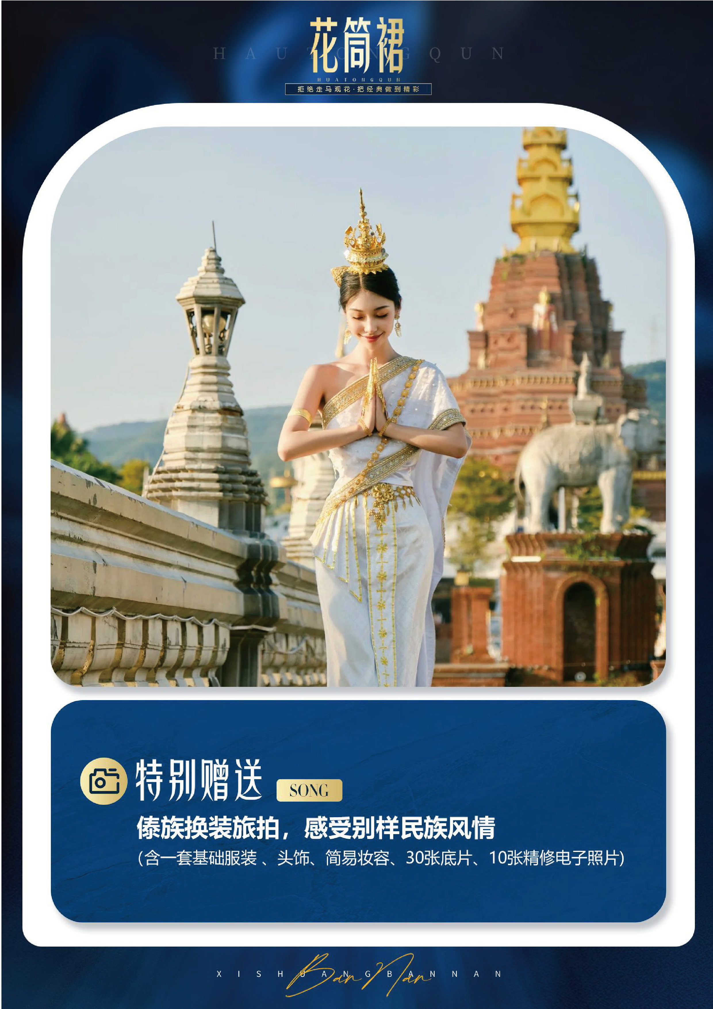 打卡网红地-湄公河·星光夜市 ,湄公河·星光夜市集结了我国云南、泰国、老挝、越南、柬埔寨等等各地的创意摊贩。各种具有创意的手工艺品是游人的最爱。在这里你可以真实感受到湄公河流域的赶摆文化。各种极具地域特色的衣服,五颜六色,是女孩子们的最爱。还有各种用于装饰的小物件,手工雕刻艺术品,是那么的精巧别致。更不要说项链啊,耳环啊等等的首饰了。体验换装旅拍(含一套基础服装 ,头饰 简易妆容 30 张底片 , 10 张精修电子照片)